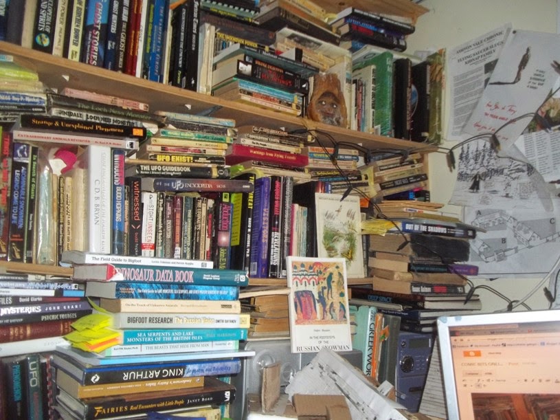 Next, hundreds of books covering the 1940s up to 2014 on subjects such as UFOs, ghosts, the paranormal, werwolves, strange phenomena, Sasquatch, Almasty, Yeti, Yeren, unidentified sea creatures ("sea monsters"), wildlife, tracking....hang on.....
